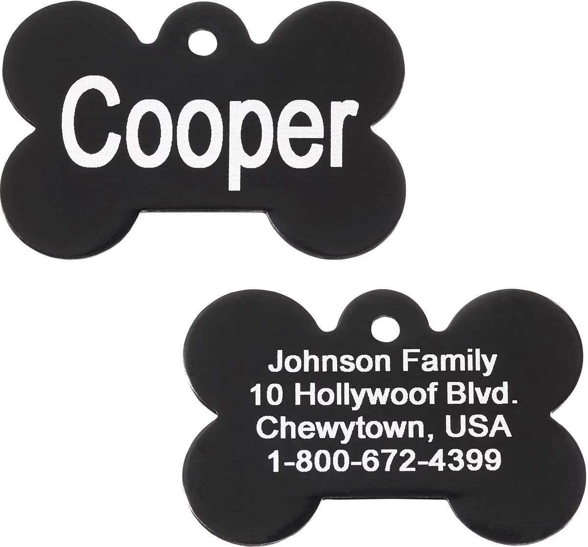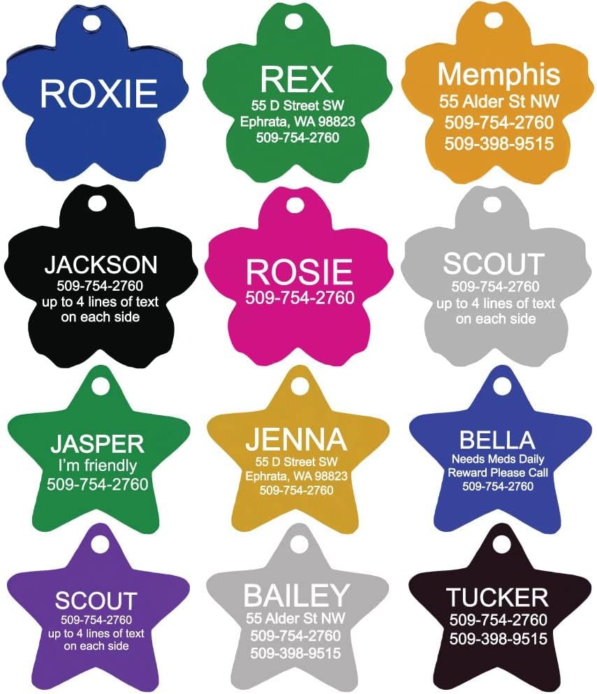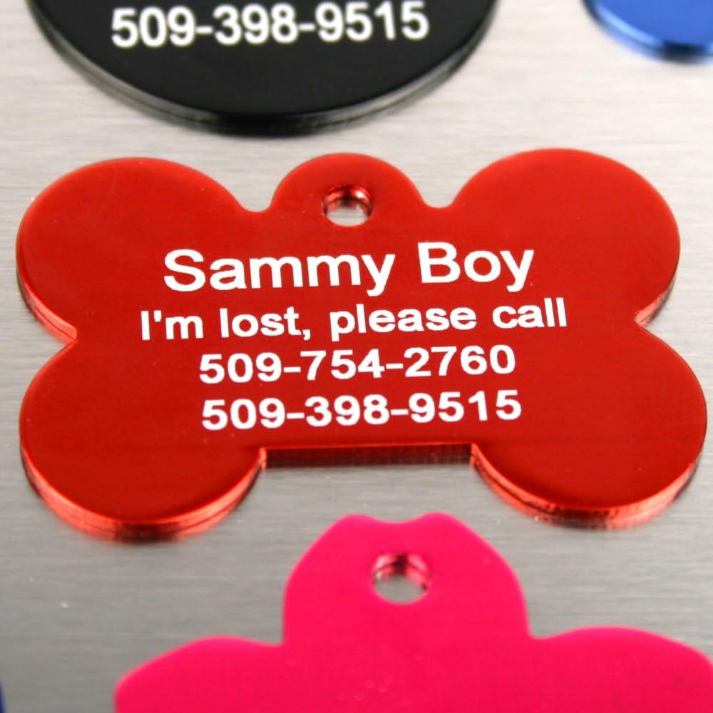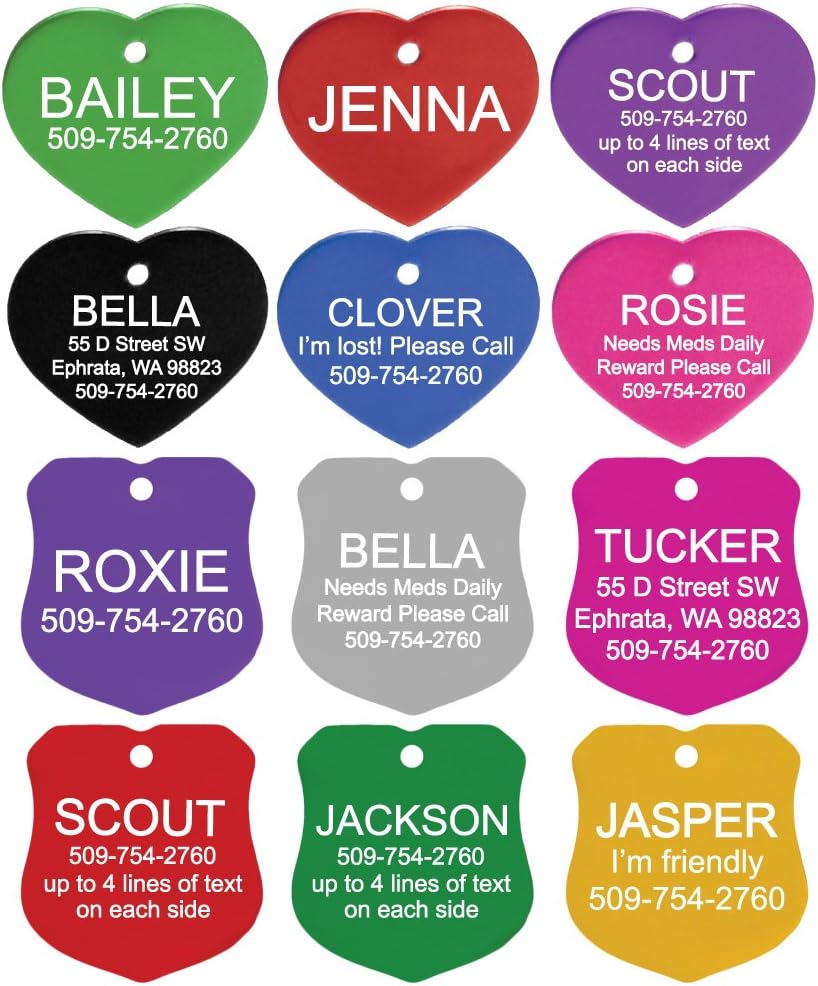 - These tags come in different shape and tag can be custom engraved on both sides with up to 3 lines of personalized text, plenty of room for all your dog’s important ID.