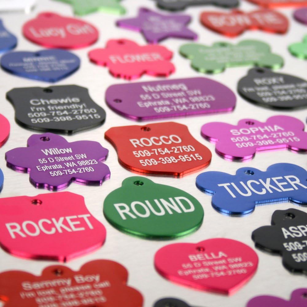 - Our personalized aluminum pet tags go through an anodized process that adds strength, durability, and brightness of color to each tag.