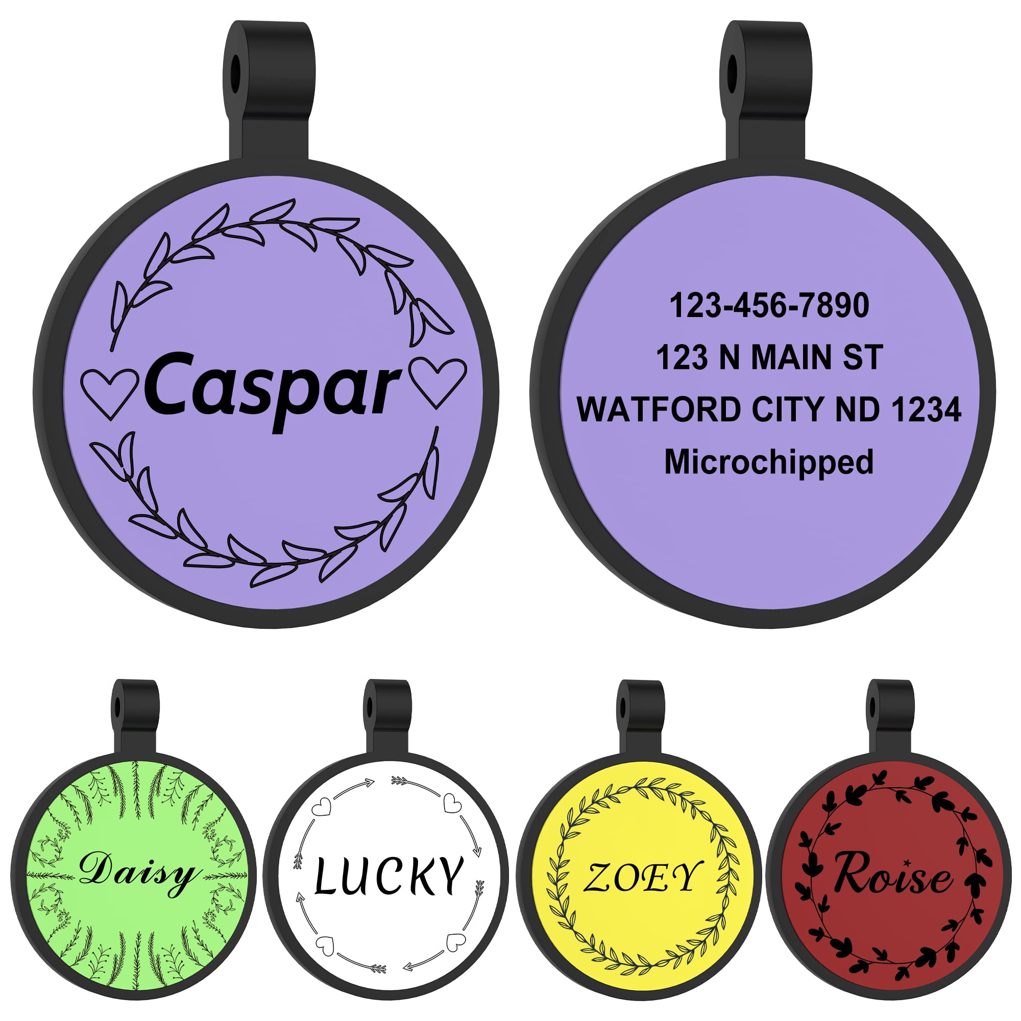 Most dog tags for pets have room for four lines of text, and some have room on the back .For starters, your dog’s name. Most important is a phone number where you can be reached. Keep in mind that you may be out searching for your lost pup, so a cell phone number probably makes the most sense. Some dog owners also include their own name and a street address. If there’s room, you can include additional information, such as whether your dog is microchipped or any urgent medical information.all of this can be customized to your liking,